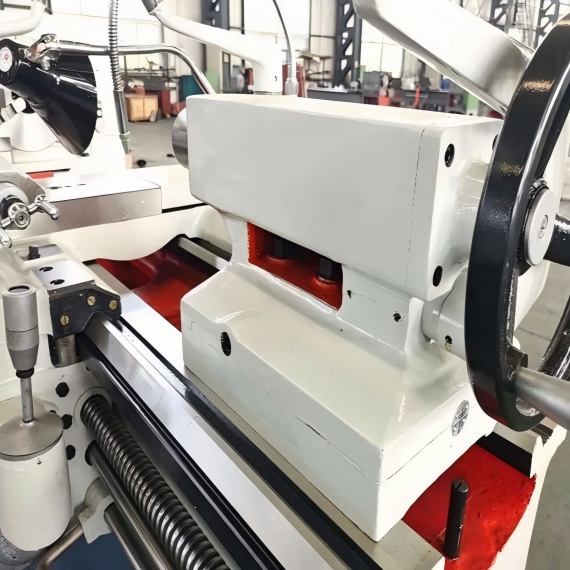 Bed swing diameter of 630 mm, saddle area extended to 800 mm, center distances of 1500/2000/3000 mm available, maximum load capacity of 3 tons, suitable for machining large-sized shaft and disc components; 104mm large-bore spindle, 18-speed range from 7.5 to 1000 rpm, standard φ315mm three-jaw chuck, suitable for both heavy-duty cutting and precision machining; X/Z-axis rapid traverse at 2300/4000 mm/min, supports all standard metric, inch, module, and pitch threads, with efficient tool changing via a four-station tool turret; 550mm-wide guideways paired with a heavy-duty bed, a powerful 11kW main motor, and a stable, durable machine design, making it suitable for heavy-duty machining requirements in industries such as mining, petroleum, and shipbuilding.